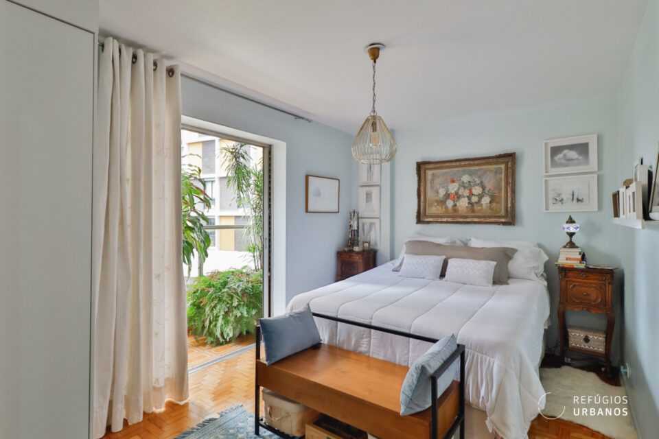 Os dormitórios são confortáveis, com pé-direito alto. O quarto principal tem marcenaria com portas espelhadas e acesso direto à varanda, criando um espaço leve e funcional.