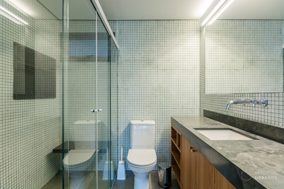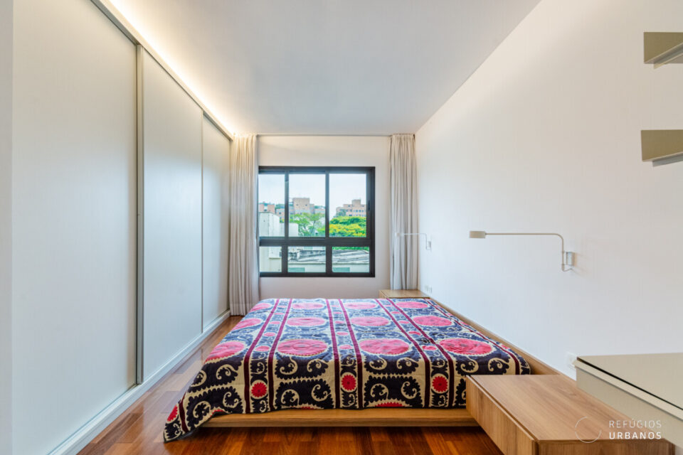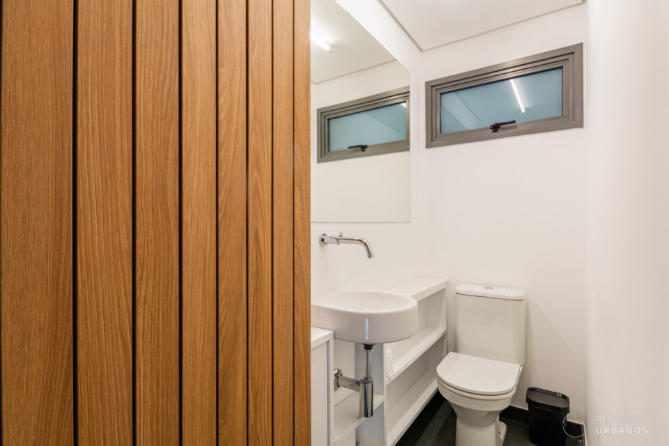 Temos um lavabo (raridade que encanta nessa metragem), uma suíte aconchegante, com cama queen feita sob medida e armários de sobra.