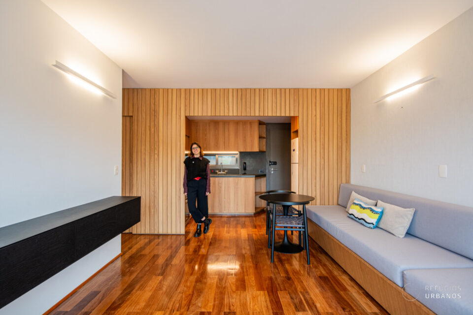 A sala e a cozinha se unem num só ambiente, com um projeto da Pianca Arquitetura: madeira, marcenaria sob medida, luz natural e uma sensação boa de que tudo encaixa perfeitamente.