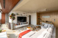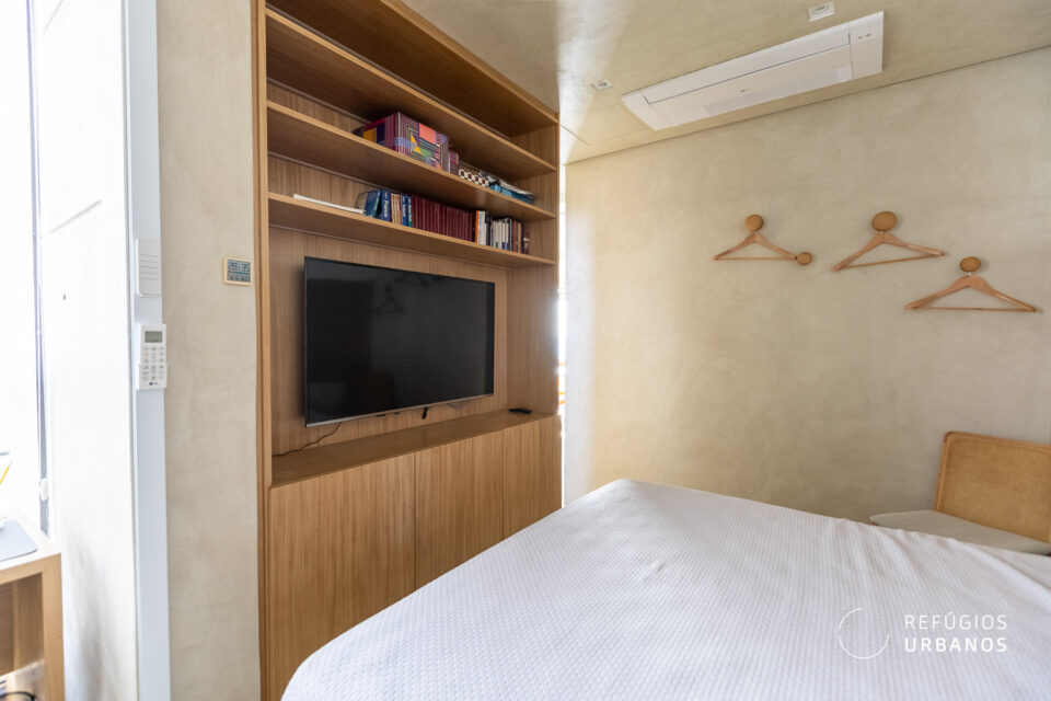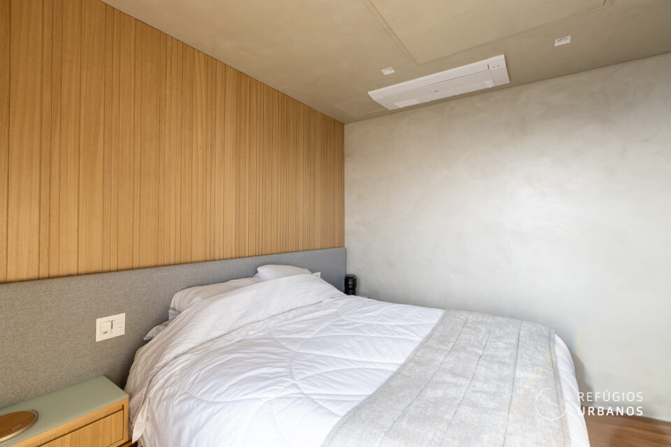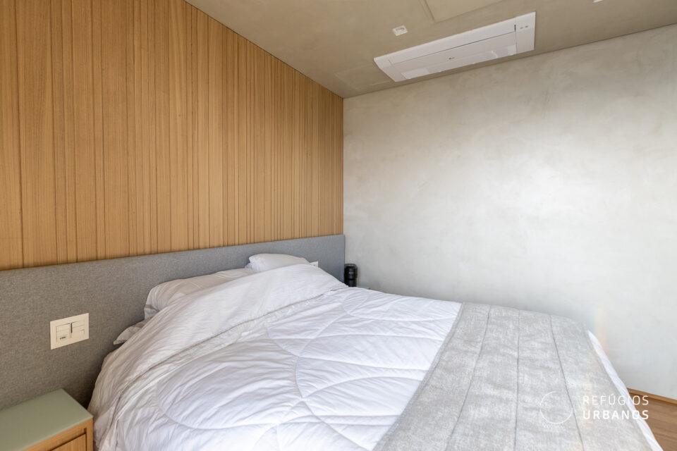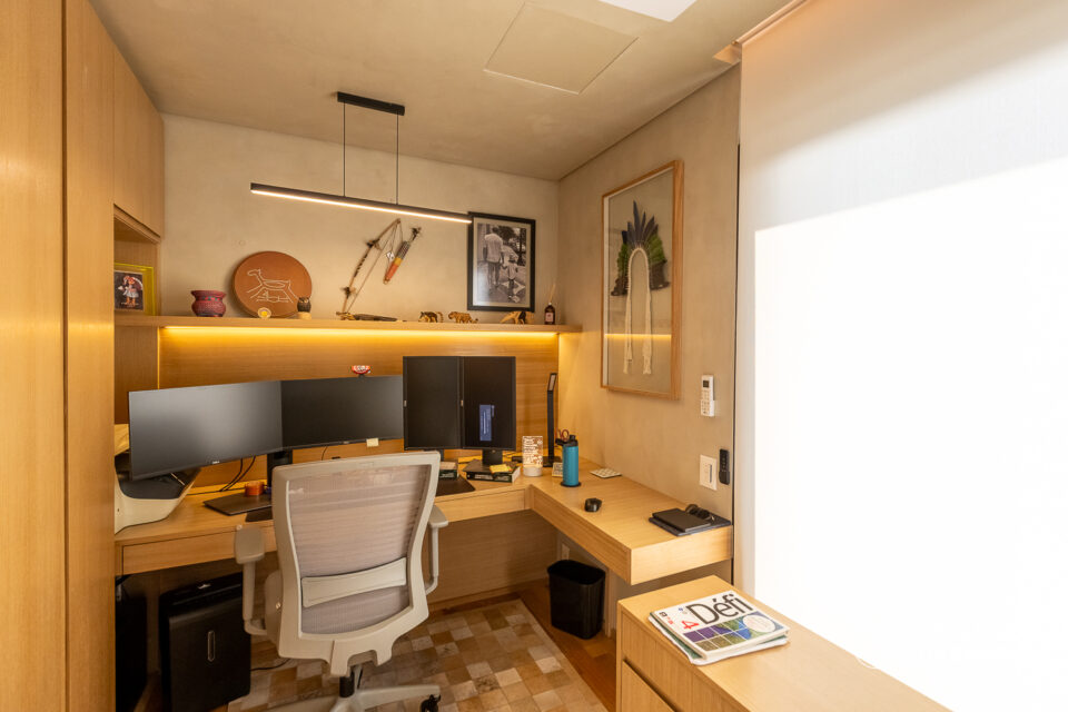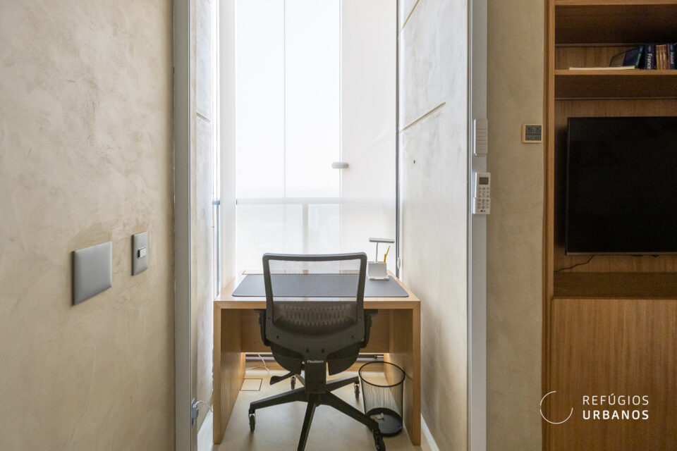 Agora vamos para a área íntima. São 3 quartos. Na disposição atual, duas suítes e um escritório que a gente curte até trabalhar. Com direito a vista eterna e um charme todo especial: painéis de madeira, tons caramelo, aquela atmosfera que mistura leveza e sofisticação do jeito certo.