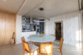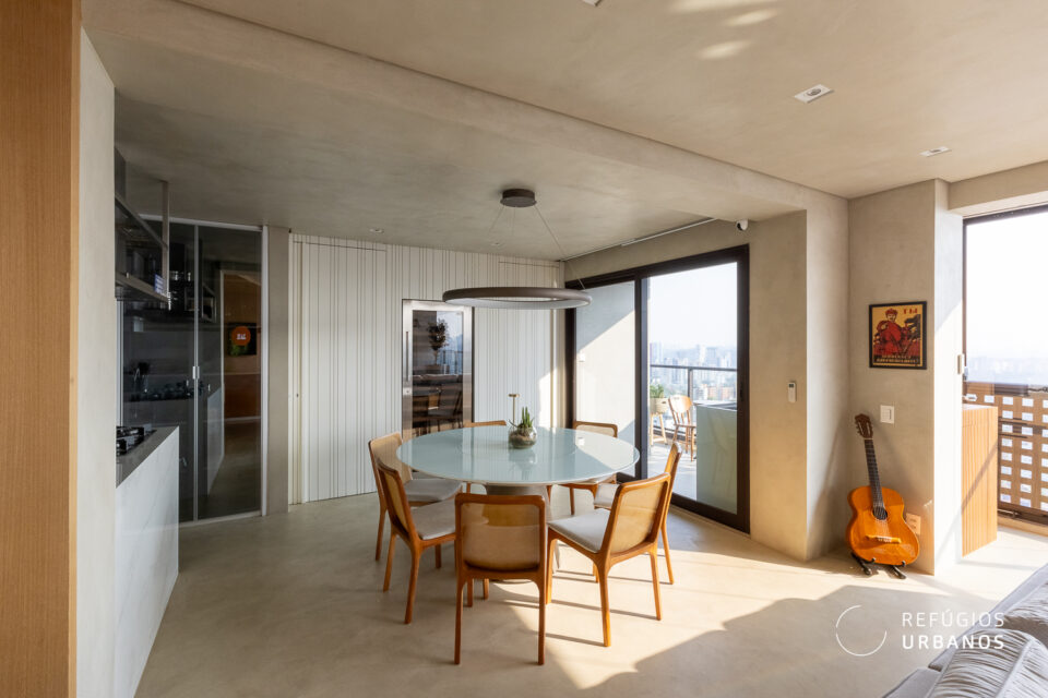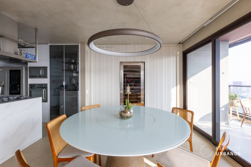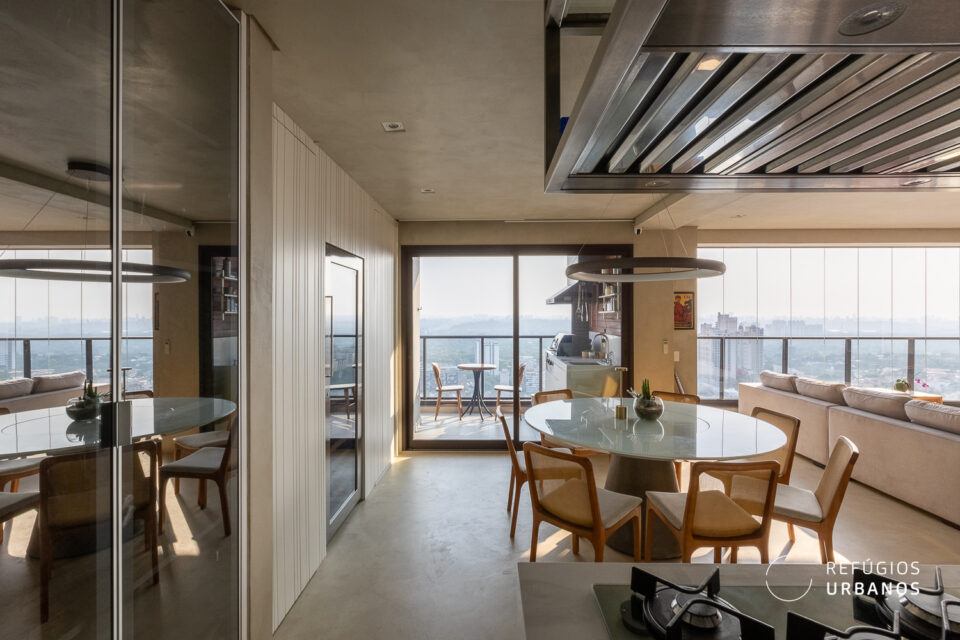 Os ambientes são integrados – a cozinha conversa com a área gourmet, que conversa com a sala de jantar, que conversa com o living. Tudo junto, mas tudo no seu devido lugar. Uma fluidez que você sente no corpo antes mesmo de entender com a cabeça.
