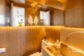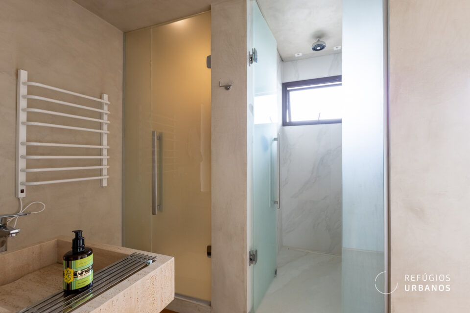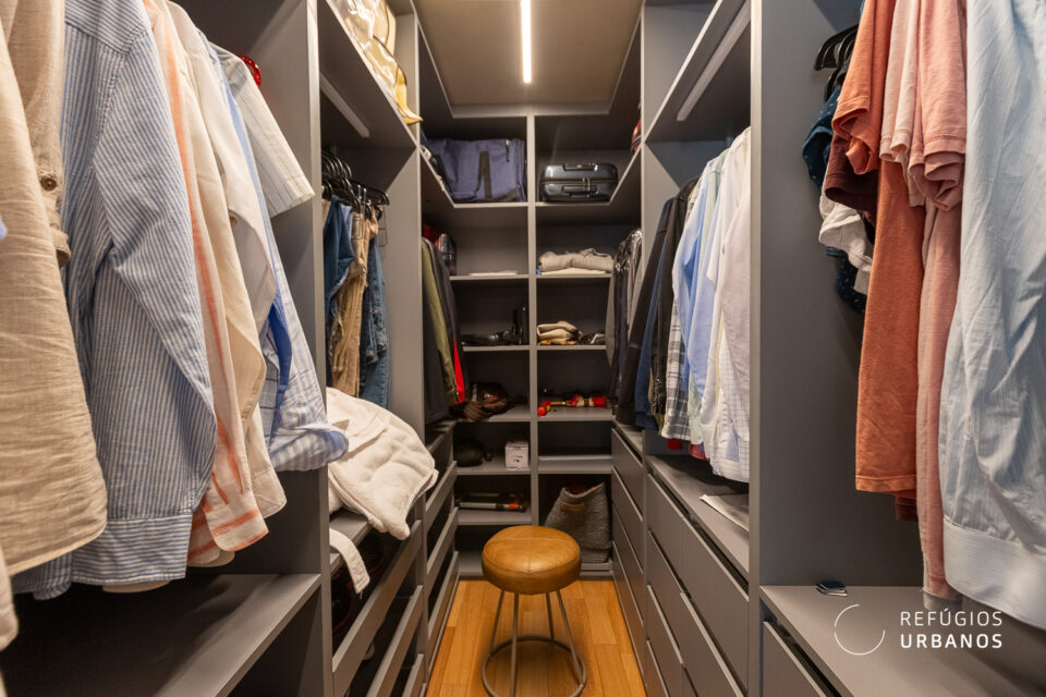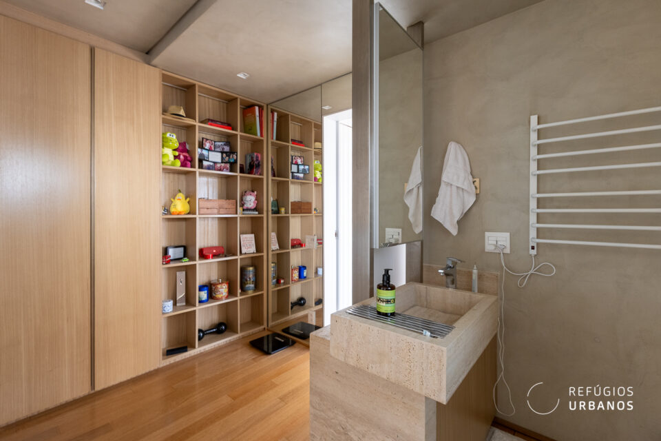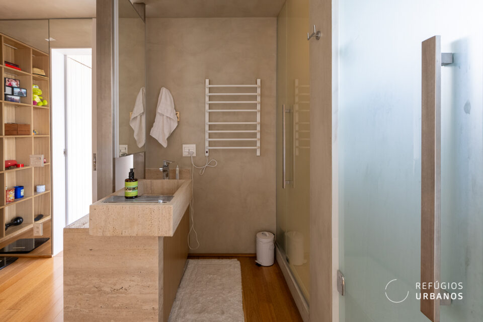 A suíte principal é de tirar o fôlego. Logo que você acessa, o corpo relaxa junto com você. Além disso, com um projeto impecável de interiores e automação completa em ar, TV e cortinas, tudo responde ao seu comando (e não somente aqui, há automação em todo o apartamento). O banheiro com bancada aberta integra ao quarto de forma delicada e, ainda, um closet generoso, para todos os gostos e para todas as fases da vida.